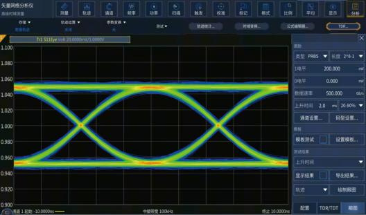 高级时域分析选件具备基于网络参数的虚拟眼图生成及分析功能。根据不同的高速数字通信标准,高级时域分析选件可以使用预先定义好的眼图模板进行高效率Pass/Fail测试。