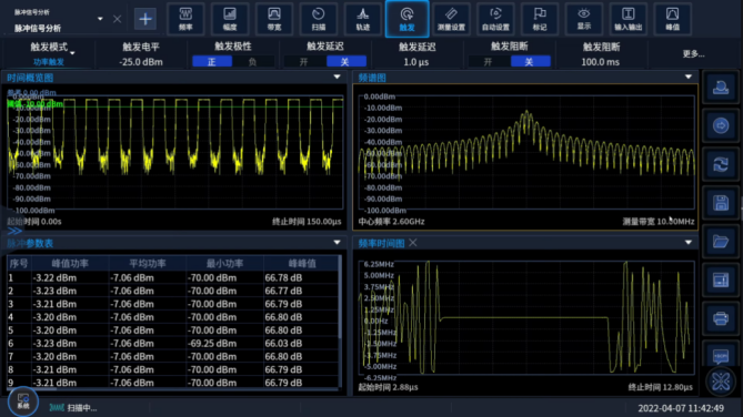 Ceyear 4082系列信号/频谱分析仪内置雷达信号测量软件,可对脉冲调制信号进行多层次的测量分析,并以频谱、时间图谱、参数表等多种显示方式展现。4082支持脉冲信号频谱、时域特性测试,可同时对脉宽、脉冲周期、脉冲上升和下降时间、脉冲内功率下降、峰值功率、最小功率、顶值、底值、脉冲幅度、预冲、过冲、频率误差峰值、频率误差有效值、频率偏移等脉冲参数进行分析显示;可对选定的任意脉冲进行幅度、脉内频率/相位特性、频谱特性的细节分析;4082还具备脉冲参数趋势分析和统计分析功能,可对脉间特征参数的变化趋势和分布特性进行分析,可方便的进行雷达系统性能衡量和问题定位。
