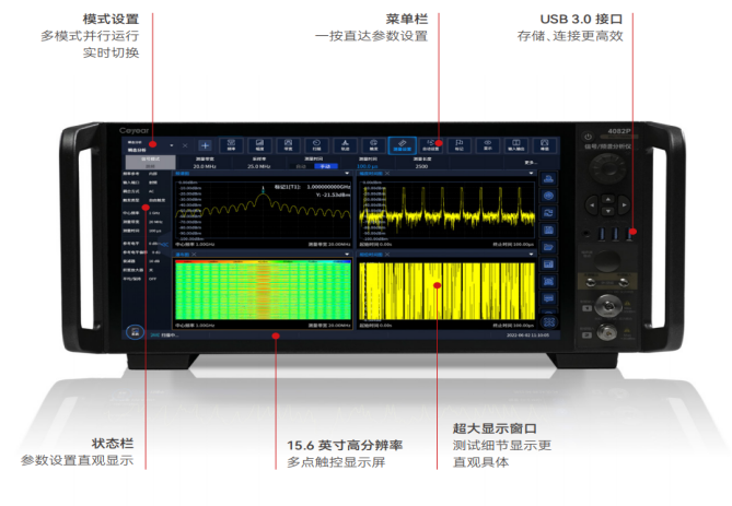 Ceyear 4082系列信号/频谱分析仪硬件配置全面提升,采用高性能处理器和超大触摸屏,仪器操作更便捷。4082采用i7处理器,16G内存,运行更流畅,保证长时间测试的高效运行;4082配置15.6英寸超大触摸屏,多种测量结果一览无余,支持多点触控,操作简洁高效。支持界面区域布局动态调整和自定义菜单。多测量模式并行运行与显示,模式切换方便灵活。