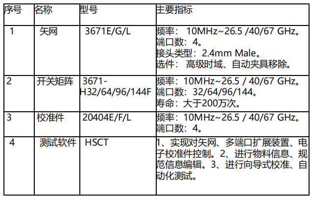 本系统由矢量网络分析仪、开关矩阵(多端口扩展装置)、电子校准件、 同轴线缆、夹具以及测试软件组成。频率覆盖 10MHz~40GHz/ 67GHz,端口数最大144。实现自动化测试和按照要求输出测试报告。