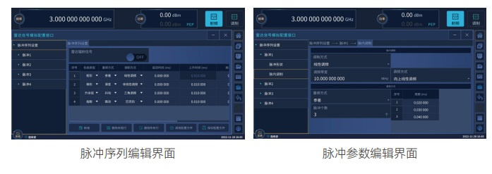 支持幅度调制、频率调制、相位调制及脉冲调制。具备双脉冲、脉冲串、重频参差、重频抖动、重频滑变等复杂脉冲调制功能。