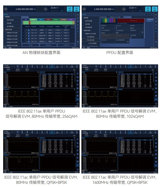 面向无线通信终端研制、生产的测试,具备802.11a/b/g/n/ac/ax无线连接PPDU、MPDU、A-MPDU等信号模拟,支持由多个不同调制编码方式的PPDU组成的物理帧块信号模拟。