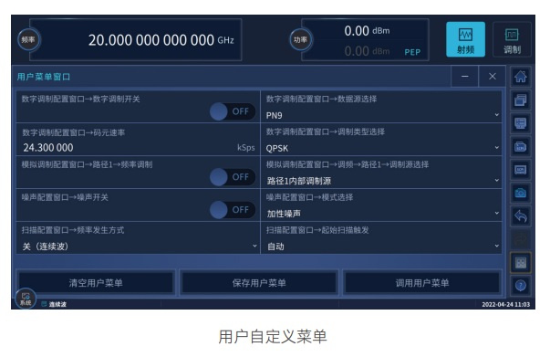 多达30多种数字标准调制信号(PSK、FSK、QAM、APSK)的产生,囊括了数字通信所有重要频段和调制样式。